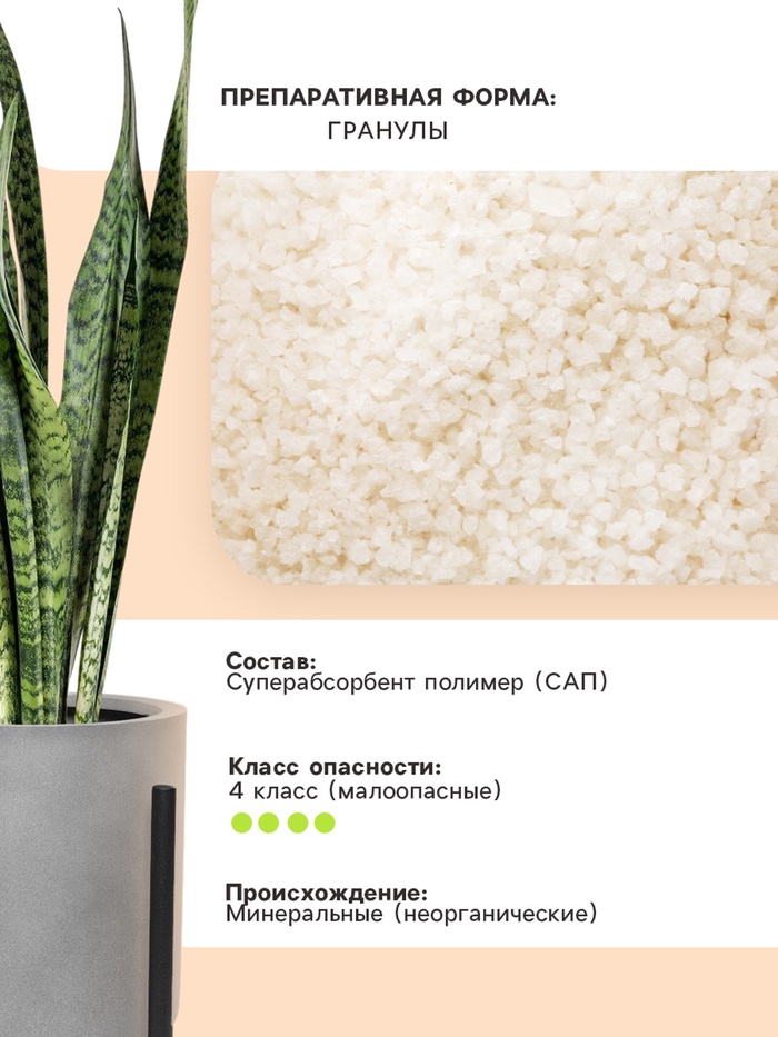 Гидрогель — это современный материал для накопления, удержания и последующей равномерной отдачи влаги. Гидрогель способен поглощать воду до 1000 раз больше собственного веса. При смешивании гидрогеля с почвосмесью для комнатных и декоративных растений норма полива сокращается на 50–60 %, а при внесении в открытый грунт — на 20–40 %. Гидрогель не теряет своих свойств после полного высушивания и замерзания. По окончании срока годности гидрогель разлагается на углекислый газ, аммоний и воду.