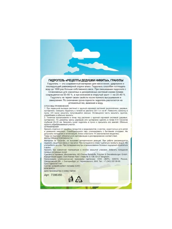Гидрогель "Рецепты Дедушки Никиты", гранула, 20 г — Характеристики