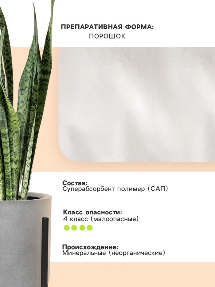 Гидрогель — это современный материал для накопления, удержания и последующей равномерной отдачи влаги. Гидрогель способен поглощать воду до 500 раз больше собственного веса. При смешивании гидрогеля с почвосмесью для комнатных и декоративных растений норма полива сокращается на 50–60 %, а при внесении в открытый грунт — на 20–40 %. Гидрогель не теряет своих свойств после полного высушивания и замерзания. По окончании срока годности гидрогель разлагается на углекислый газ, аммоний и воду.