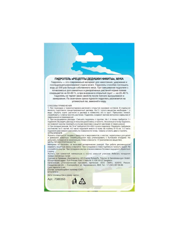Гидрогель «Рецепты Дедушки Никиты», мука, 100 г — Характеристики