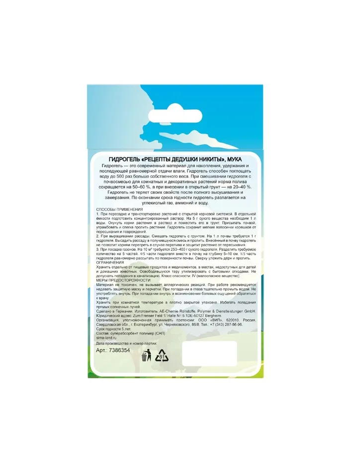 Гидрогель "Рецепты Дедушки Никиты", мука, 50 г — Характеристики
