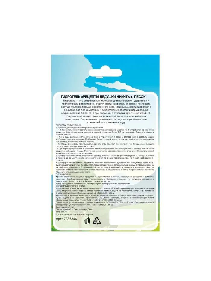 Гидрогель "Рецепты Дедушки Никиты", песок, 20 г — Характеристики