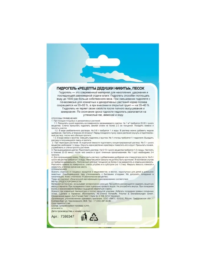 Гидрогель "Рецепты Дедушки Никиты", песок, 50 г — Характеристики