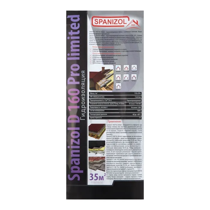 SpanIzol D максимальной (из серии) плотности (усиленная гидроизоляция) - ткань из первичных полипропиленовых волокон поперечного плетения, с двумя ламинирующими слоями. Защищает стеновые, кровельные и другие элементы конструкций в зданиях всех типов от влаги, ветра и пыли.