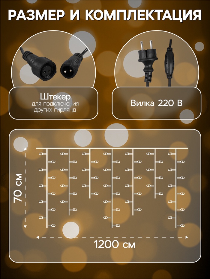 Гирлянда «Бахрома» 12×0.7 м, IP44, УМС, тёмная нить, 240 LED, свечение тёплое белое, мерцание, 220 В — Характеристики