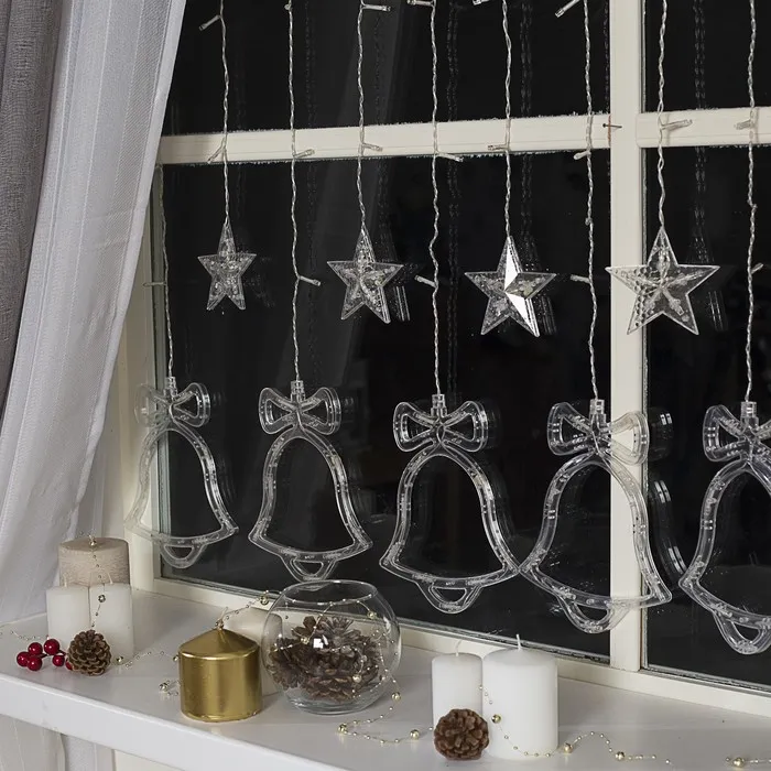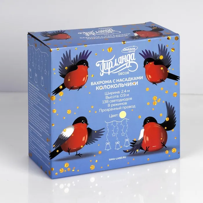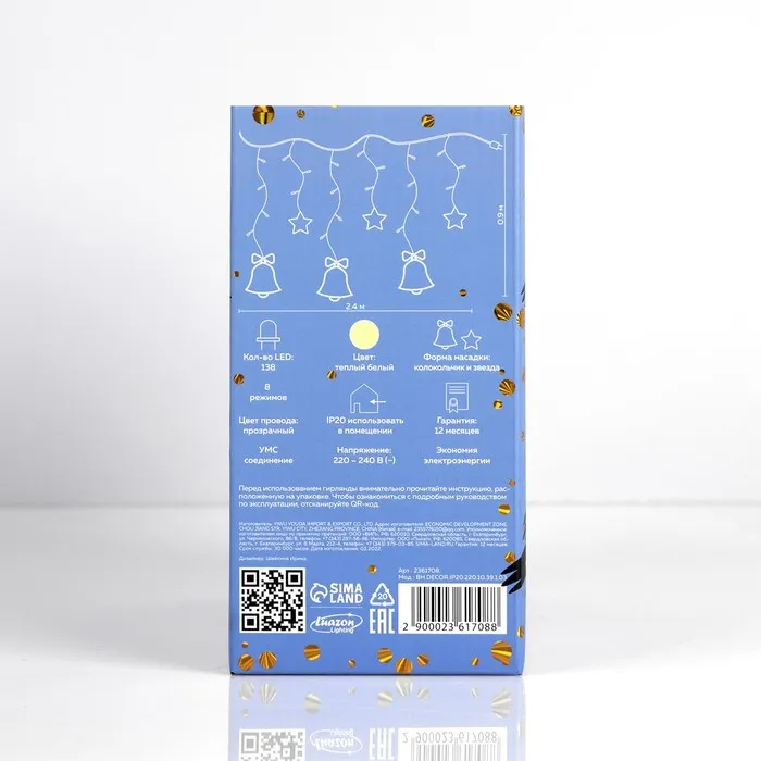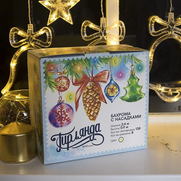 Гирлянда «Бахрома» 2.4 × 0.9 м с насадками «Колокольчики», IP20, прозрачная нить, 138 LED, свечение тёплое белое, 8 режимов, 220 В — Характеристики