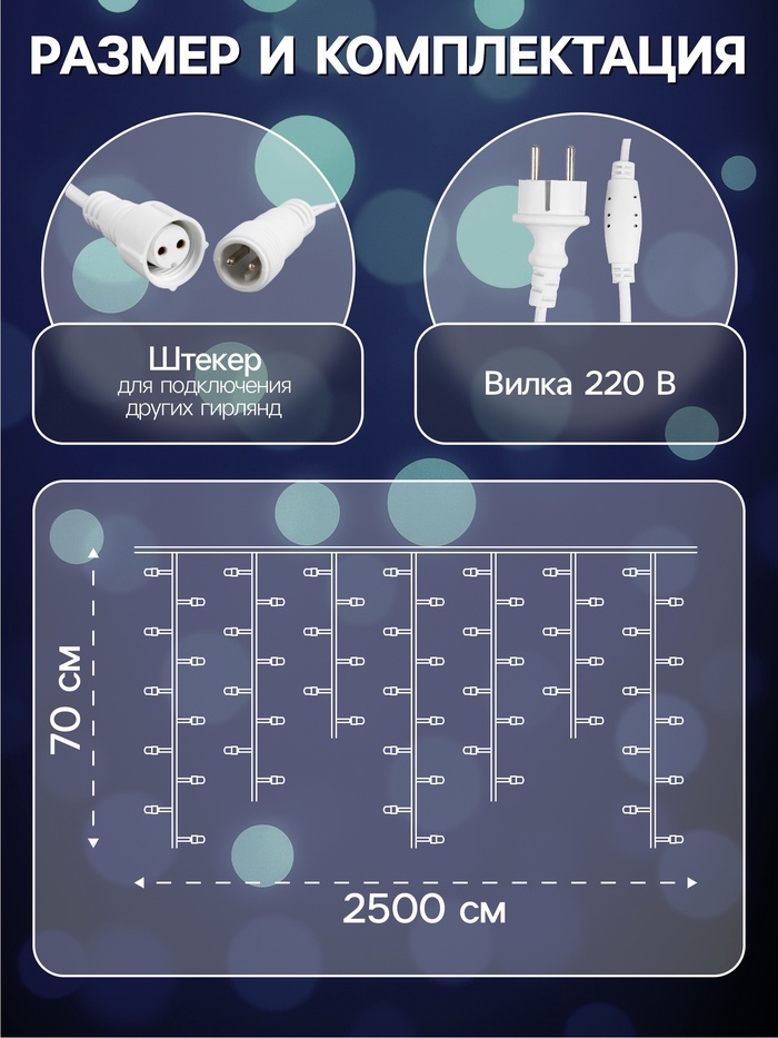Гирлянда «Бахрома» 25×0.7 м, IP44, УМС, белая нить, 450 LED, свечение белое, мерцание, 220 В — Характеристики