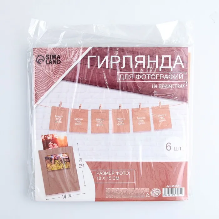 Создать соответствующее настроение дома или в офисе поможет оригинальная гирлянда! Она станет завершающим акцентом в интерьере. Декор легко подвесить на стену с помощью прищепок и веревки (входит в комплект). Вставьте любимые фотографии в элементы гирлянды и ваш дом наполнится яркими воспоминаниями. Размер места под фото 10 х 15 см.