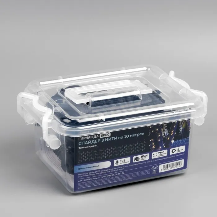 Гирлянда «Клип-лайт» 3 нити по 10 м, IP44, УМС, тёмная нить, 198 LED, свечение белое, 8 режимов, 24 В — Характеристики