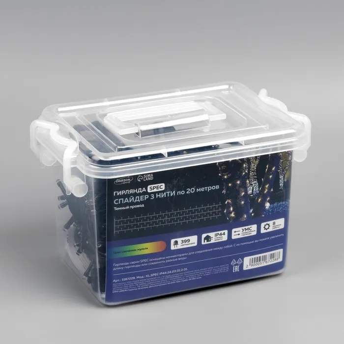 Гирлянда «Клип-лайт» 3 нити по 20 м, IP44, УМС, тёмная нить, 399 LED, свечение мульти, 8 режимов, 24 В — Характеристики