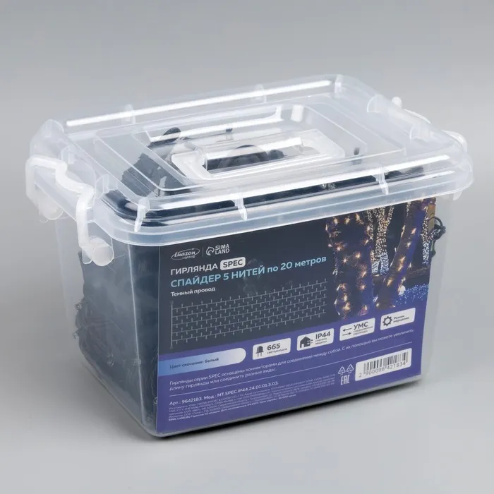 Гирлянда «Клип-лайт» 5 нитей по 20 м, IP44, УМС, тёмная нить, 665 LED, свечение белое, мерцание, 24 В — Характеристики