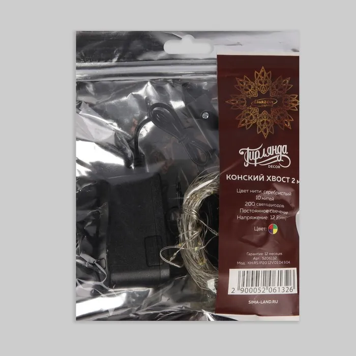 Гирлянда «Конский хвост» 10 нитей по 2 м, IP20, серебристая нить, 200 LED, свечение мульти, 12 В — Характеристики