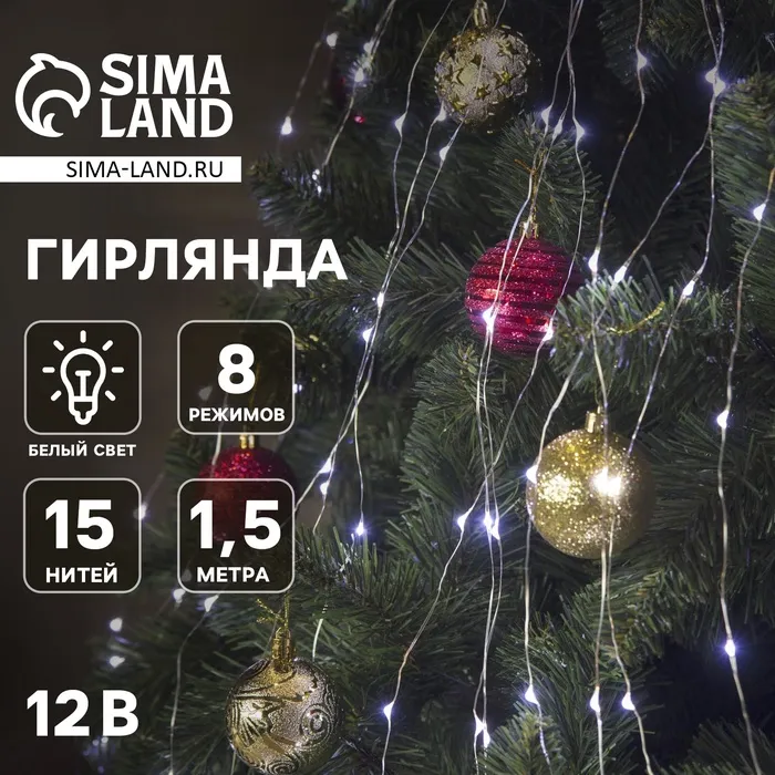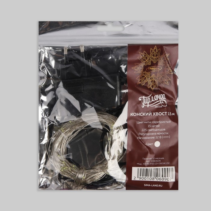 Гирлянда «Конский хвост» 15 нитей по 1.5 м, IP20, серебристая нить, 225 LED, свечение белое, 8 режимов, 12 В — Характеристики