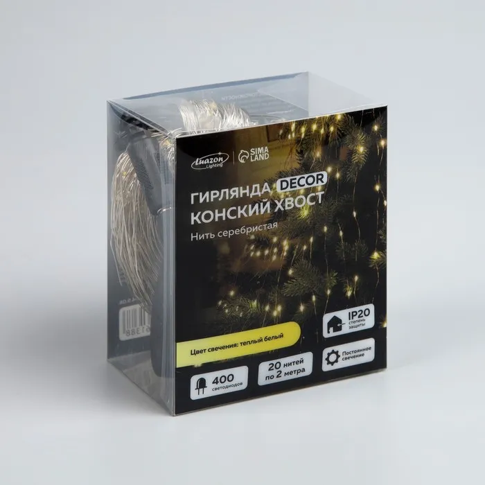 Гирлянда «Конский хвост» 20 нитей по 2 м, IP20, серебристая нить, 400 LED, свечение тёплое белое, 12 В — Характеристики