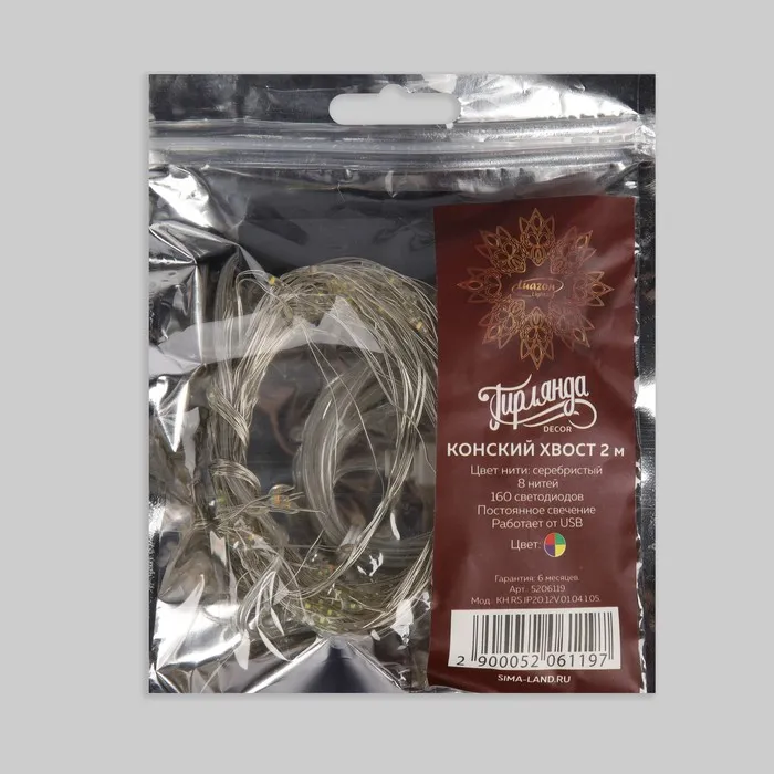 Гирлянда «Конский хвост» 8 нитей по 2 м, IP20, серебристая нить, 160 LED, свечение мульти, USB — Характеристики