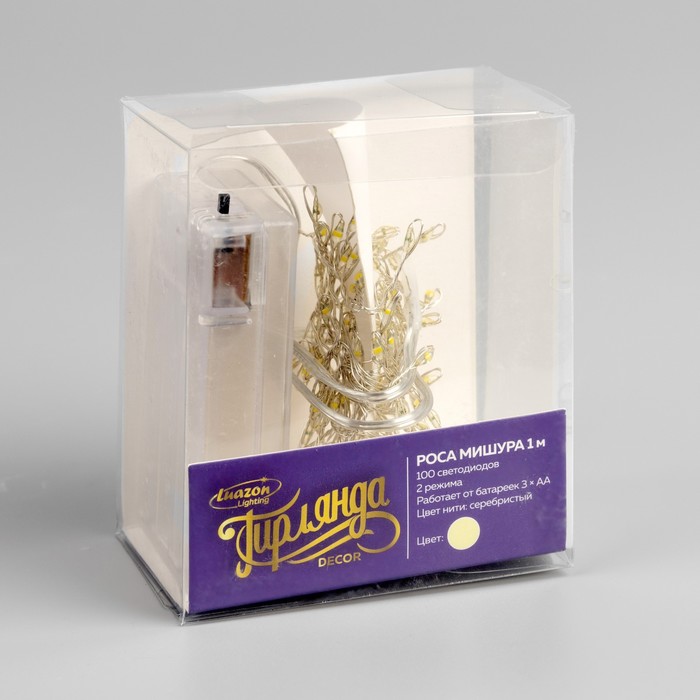 Гирлянда «Мишура» 1 м роса, IP20, серебристая нить, 100 LED, 2 режима, батарейки AAх3 (нет в комплекте), свечение тёплое белое — Характеристики