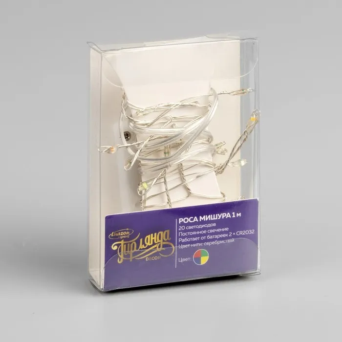 Гирлянда «Мишура» 1 м роса, IP20, серебристая нить, 20 LED, батарейки CR2032х2 (в комплекте), свечение мульти — Характеристики