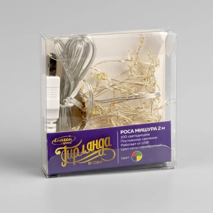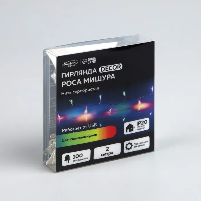 Гирлянда «Мишура» 2 м роса, IP20, серебристая нить, 100 LED, свечение мульти, USB — Характеристики