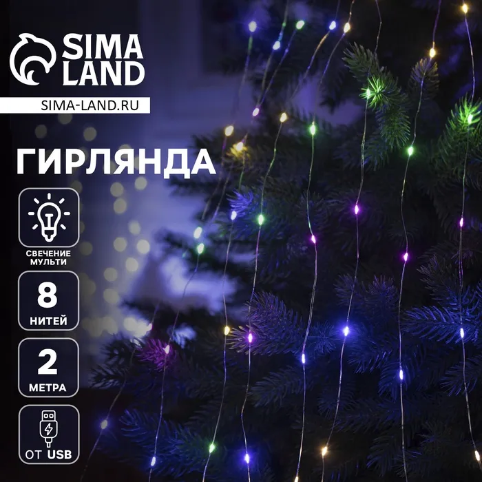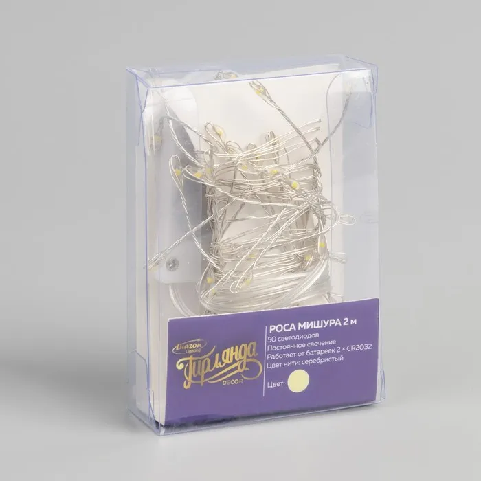 Гирлянда «Мишура» 2 м роса, IP20, серебристая нить, 50 LED, батарейки CR2032х2 (в комплекте), свечение тёплое белое — Характеристики