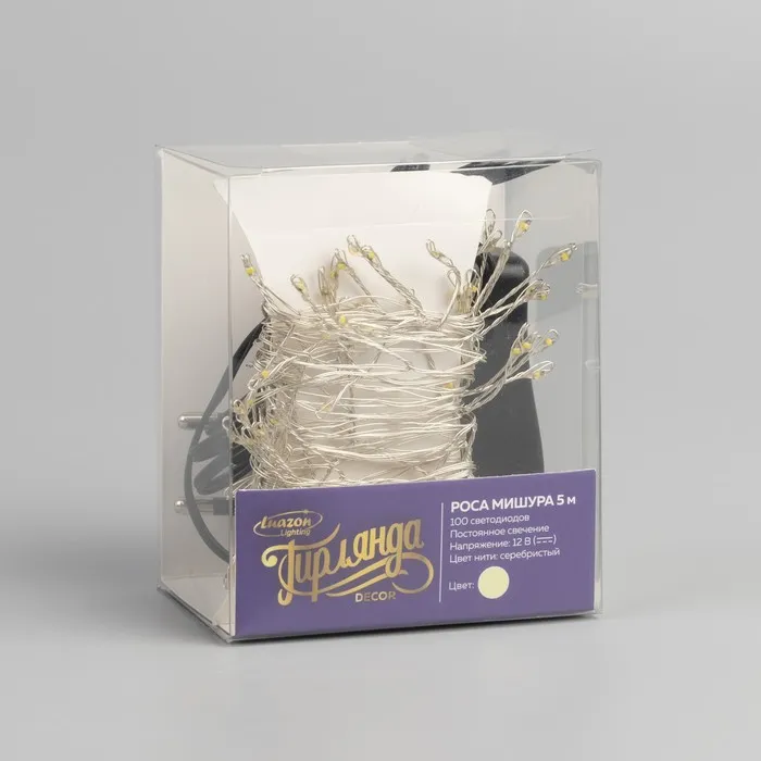 Гирлянда «Мишура» 5 м роса, IP20, серебристая нить, 100 LED, свечение тёплое белое, 12 В — Характеристики