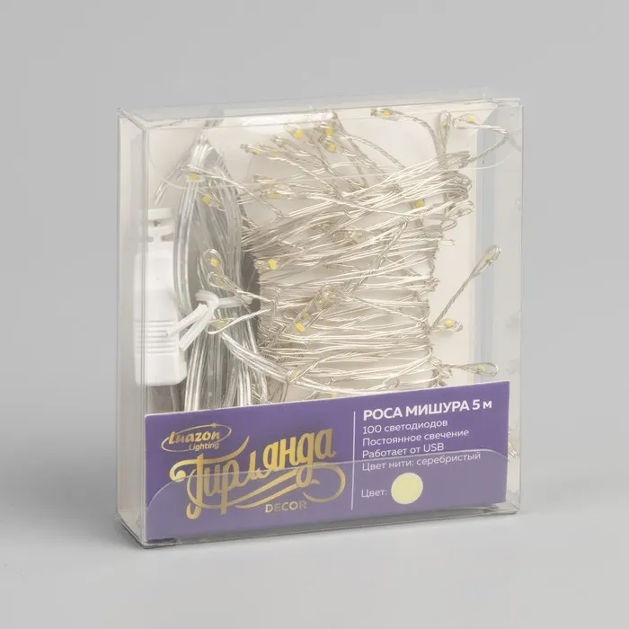 Гирлянда «Мишура» 5 м роса, IP20, серебристая нить, 100 LED, свечение тёплое белое, USB — Характеристики
