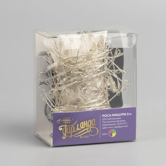 Гирлянда «Мишура» 5 м роса, IP20, серебристая нить, 200 LED, свечение мульти, 12 В — Характеристики