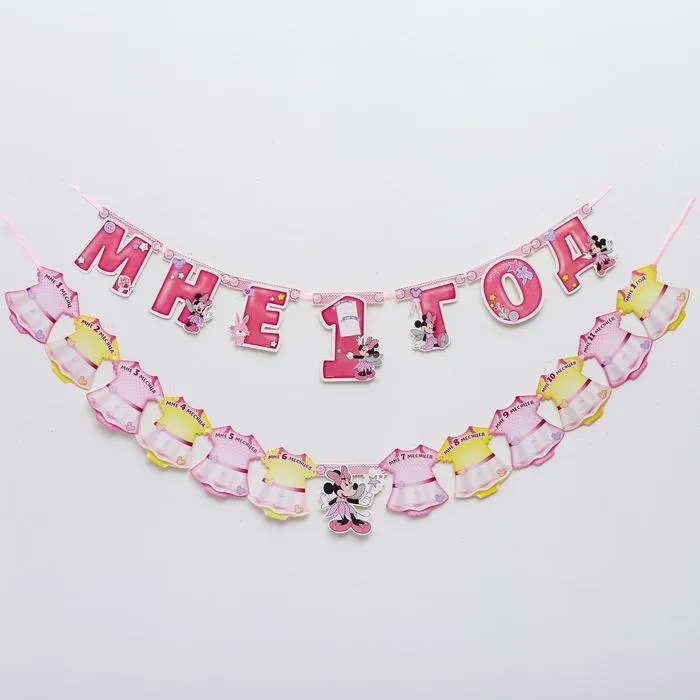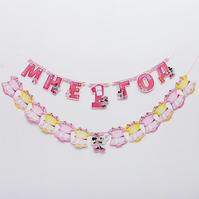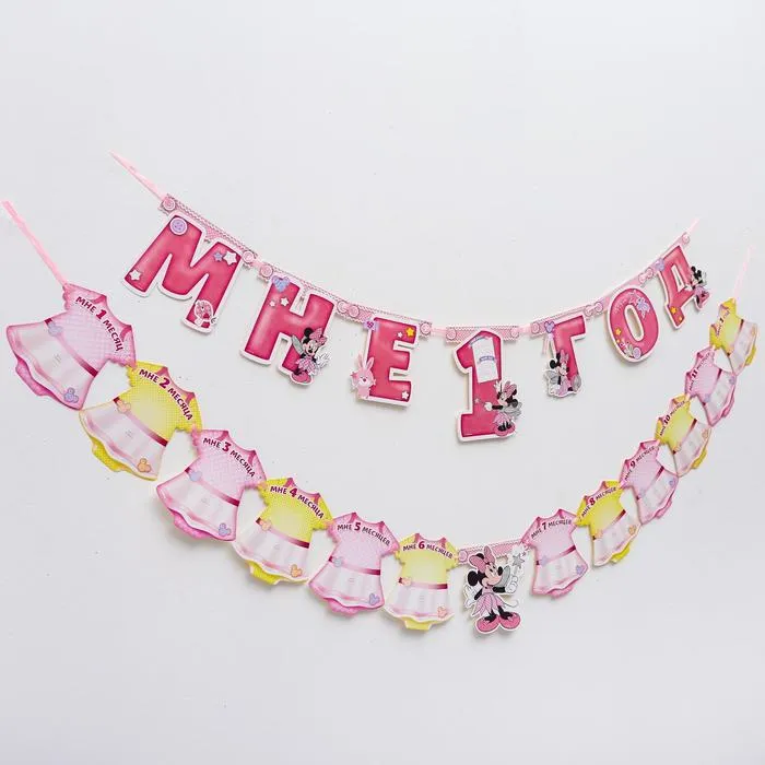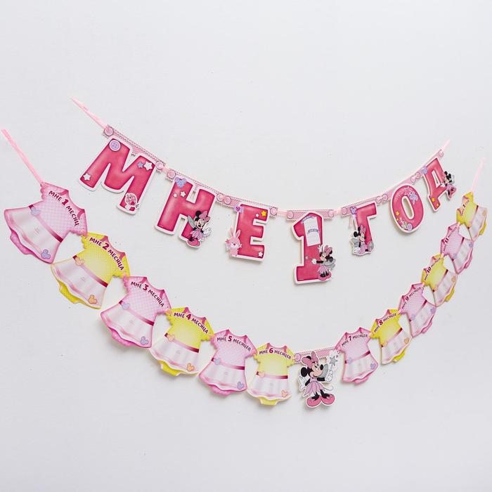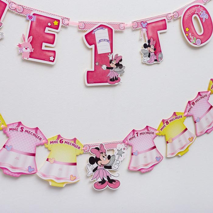 Гирлянда на ленте «Мне 1 год», с 12 карточками для фото, Минни Маус