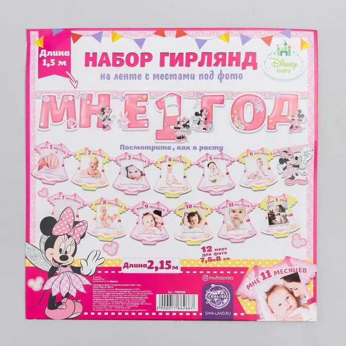 Гирлянда на ленте «Мне 1 год», с 12 карточками для фото, Минни Маус — Характеристики