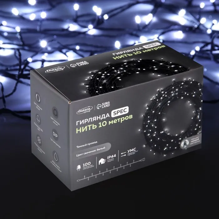 Гирлянда «Нить» 10 м, IP44, УМС, тёмная нить, 100 LED, свечение белое, мерцание всех светодиодов, 24 В — Характеристики