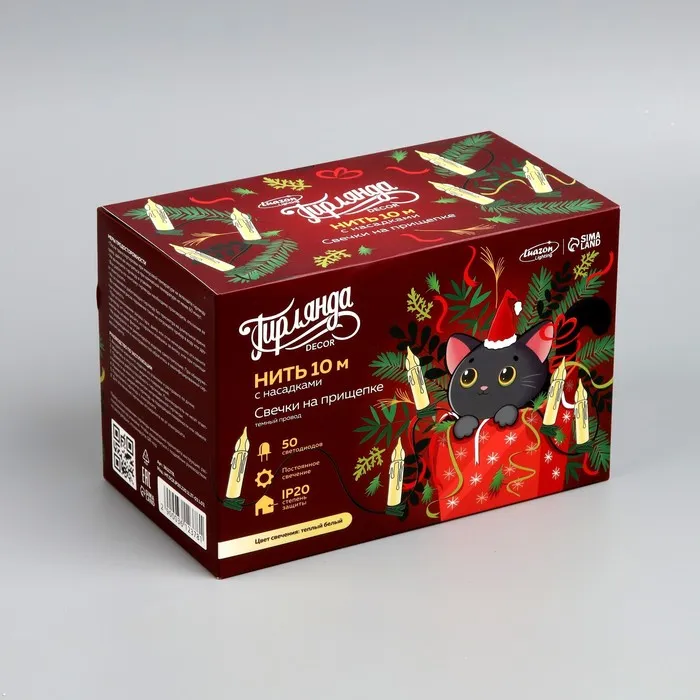 Гирлянда «Нить» 10 м с насадками «Свечи на прищепке», IP20, тёмная нить, 50 LED, свечение тёплое белое, 220 В — Характеристики