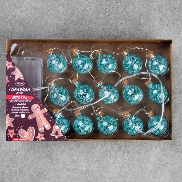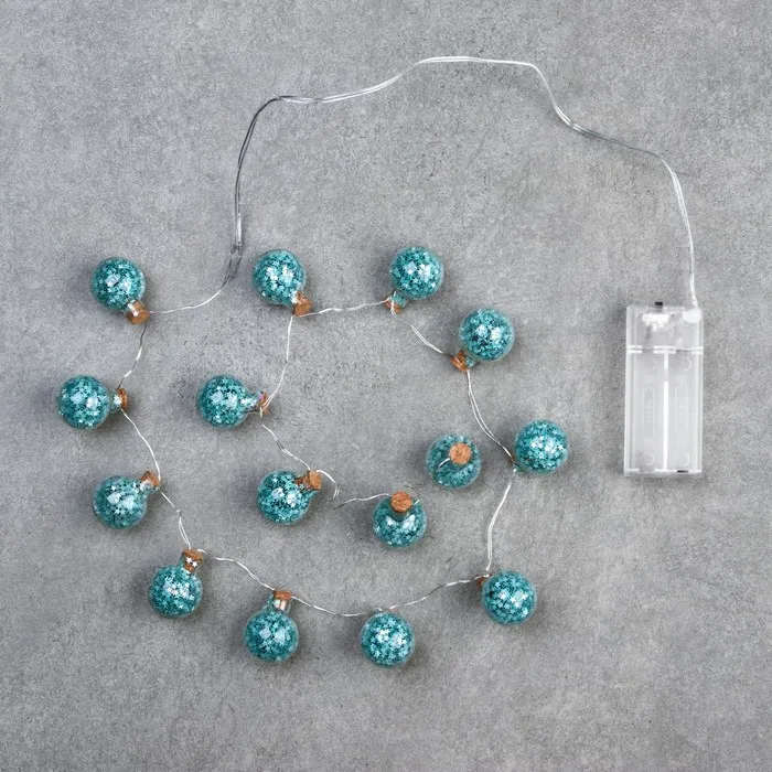 Гирлянда «Нить» 1.6 м с насадками «Бирюзовые шарики», IP20, серебристая нить, 15 LED, батарейки ААх2 (нет в комплекте), свечение белое — Характеристики