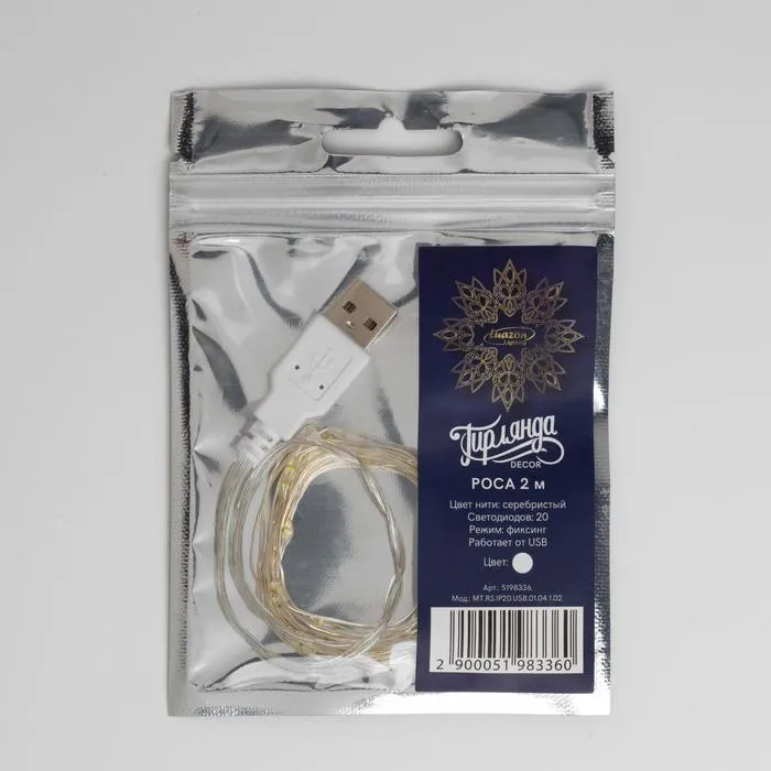 Гирлянда «Нить» 2 м роса, IP20, серебристая нить, 20 LED, свечение белое, USB — Характеристики
