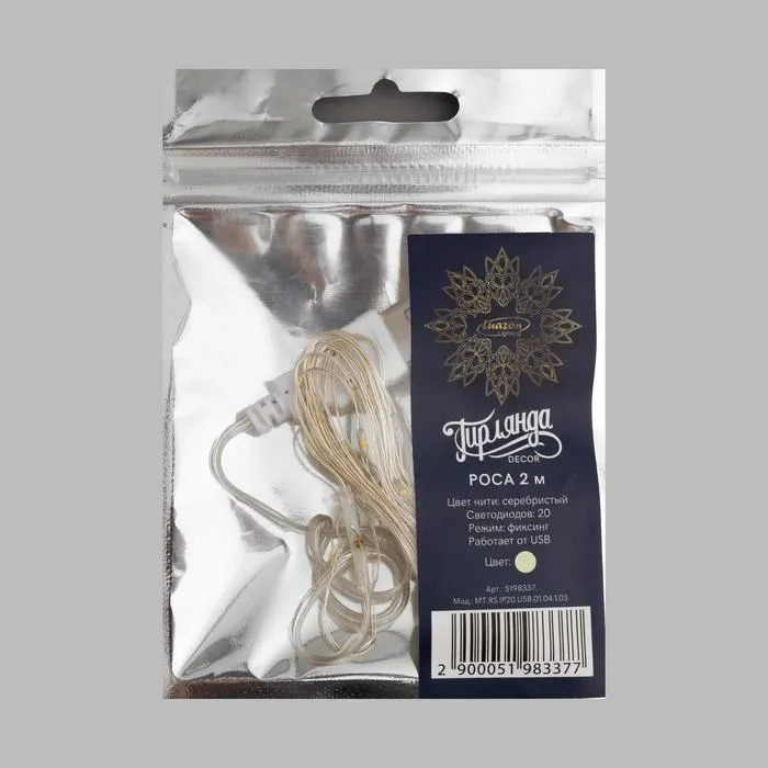 Гирлянда «Нить» 2 м роса, IP20, серебристая нить, 20 LED, свечение тёплое белое, USB — Характеристики