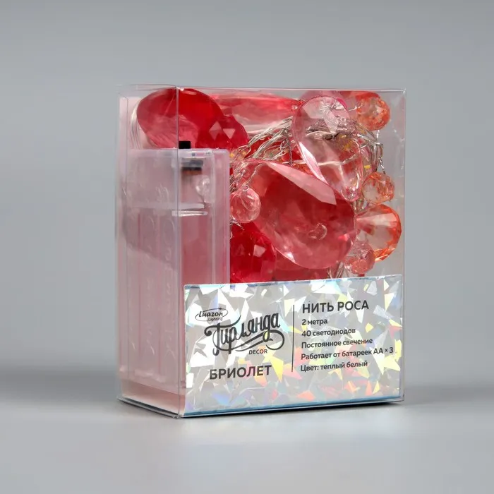 Гирлянда «Нить» 2 м роса с насадками «Бриолет», IP20, серебристая нить, 40 LED, батарейки ААх3 (нет в комплекте), свечение тёплое белое — Характеристики
