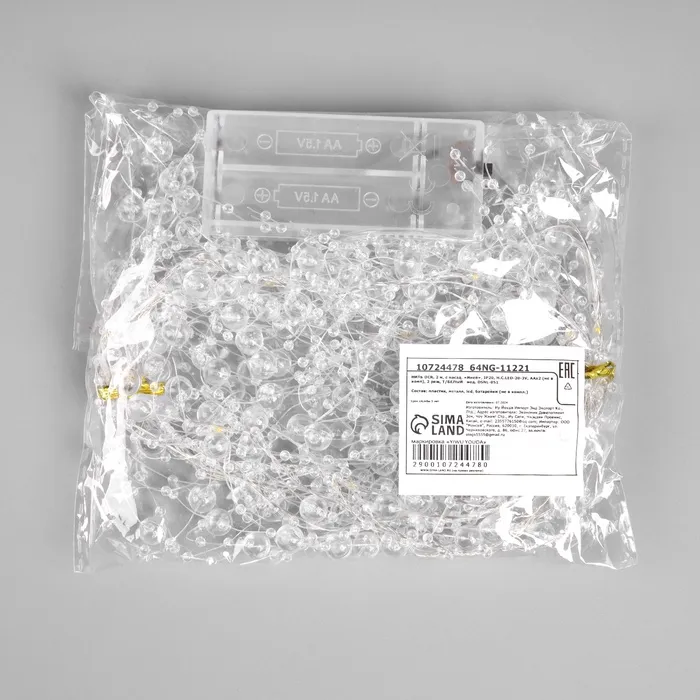 Гирлянда «Нить» 2 м роса с насадками «Иней», IP20, нить серебристая, 20 LED, батарейки AAx2 (не в комплекте), 2 режима, свечение тёплое белое — Характеристики