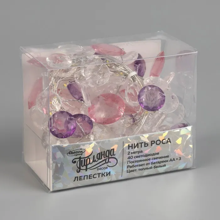 Гирлянда «Нить» 2 м роса с насадками «Лепестки», IP20, серебристая нить, 40 LED, свечение тёплое белое, ААх3 — Характеристики