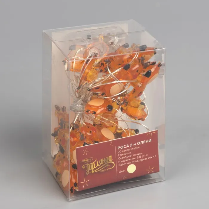Гирлянда «Нить» 2 м роса с насадками «Олень», IP20, серебристая нить, 20 LED, 2 режима, батарейка ААх2 (нет в комплекте), свечение тёплое белое — Характеристики