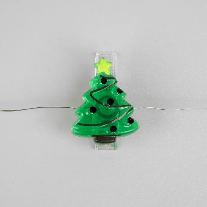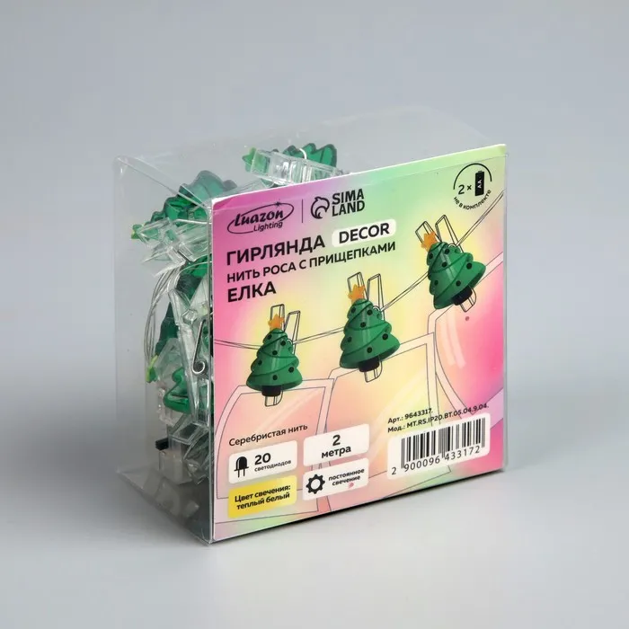 Гирлянда «Нить» 2 м роса с насадками «Прищепки-ёлки», IP20, серебристая нить, 20 LED, батарейки ААх2 (нет в комплекте), свечение тёплое белое
