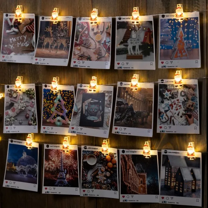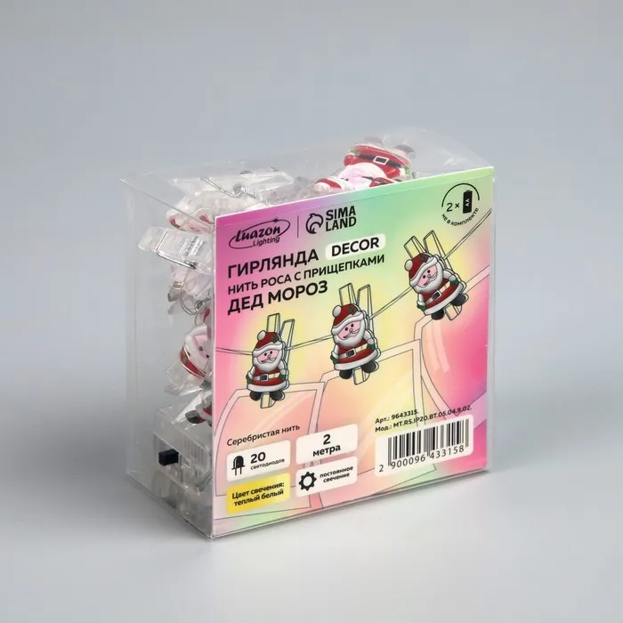 Гирлянда «Нить» 2 м роса с насадками «Прищепки с Дедом Морозом», IP20, серебристая нить, 20 LED, батарейки ААх2 (нет в комплекте), свечение тёплое белое — Характеристики