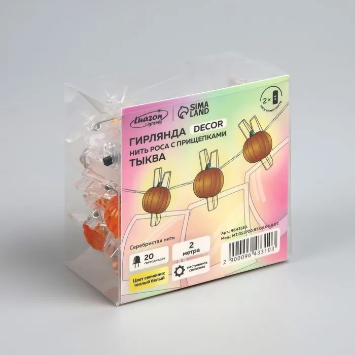 Гирлянда «Нить» 2 м роса с насадками «Прищепки-тыквы», IP20, серебристая нить, 20 LED, батарейки ААх2 (нет в копмплекте), свечение тёплое белое — Характеристики