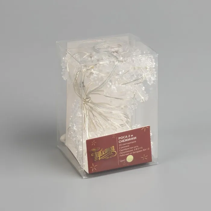 Гирлянда «Нить» 2 м роса с насадками «Снежинка», IP20, серебристая нить, 20 LED, 2 режима, батарейки ААх2 (нет в комплекте), свечение тёплое белое — Характеристики