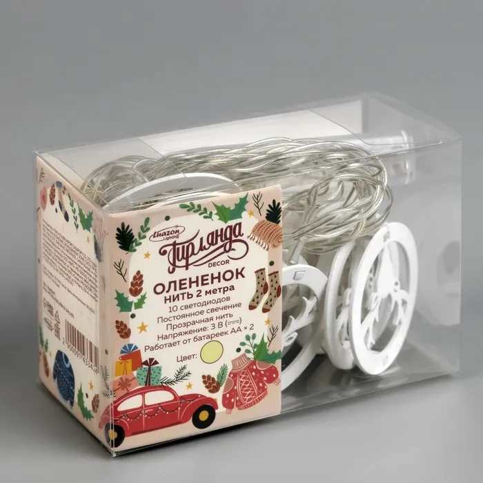 Гирлянда «Нить» 2 м с насадками «Олень», IP20, прозрачная нить, 10 LED, батарейки AAх2 (нет в комплекте), свечение тёплое белое — Характеристики