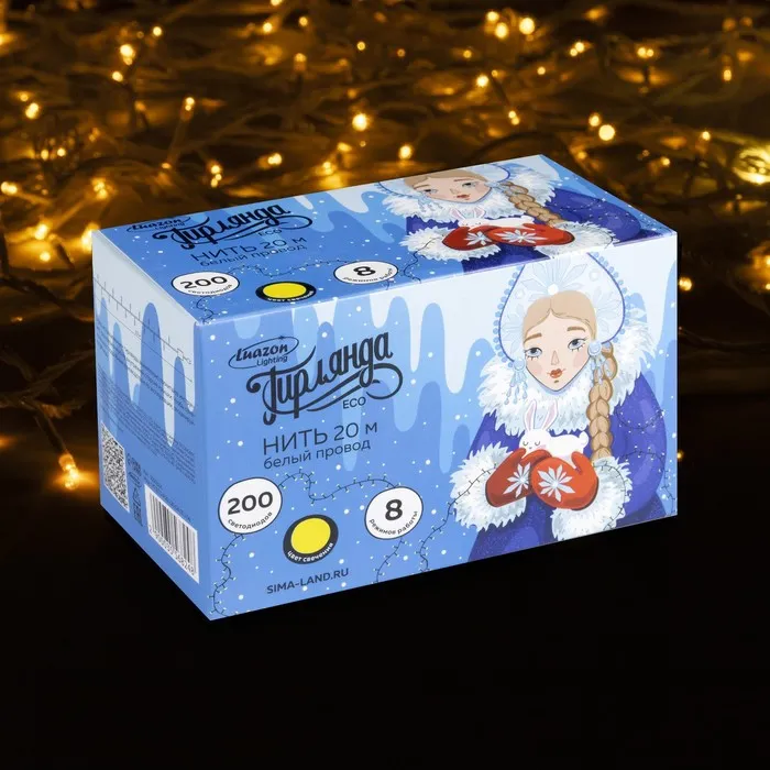 Гирлянда «Нить» 20 м, IP20, белая нить, 200 LED, свечение жёлтое, 8 режимов, 220 В — Характеристики