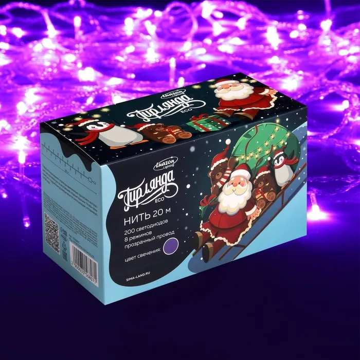 Гирлянда «Нить» 20 м, IP20, прозрачная нить, 200 LED, свечение фиолетовое, 8 режимов, 220 В — Характеристики