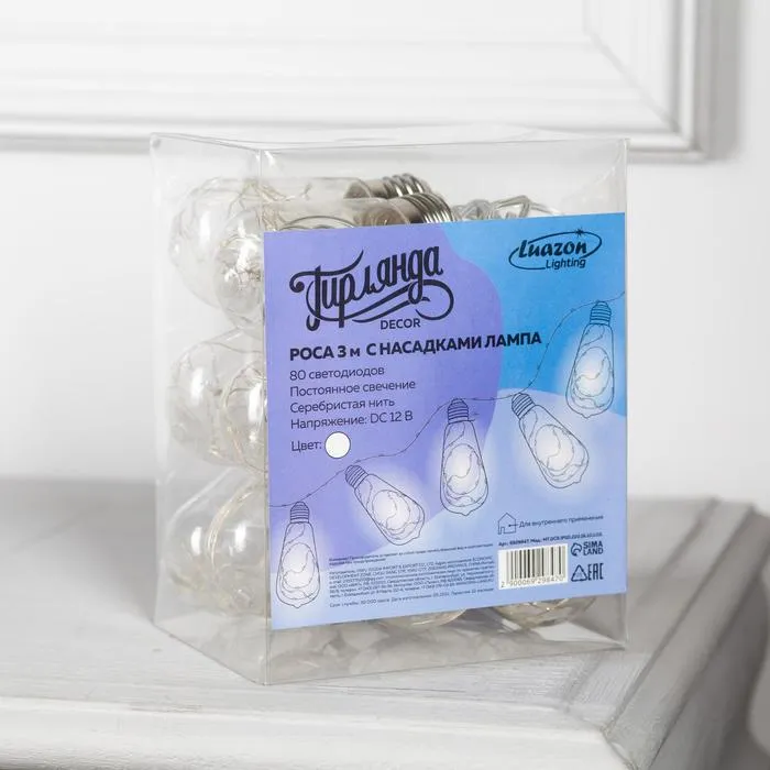 Гирлянда «Нить» 3 м с насадками «Лампа», IP20, прозрачная нить, 80 LED, свечение белое, 8 режимов, 220 В — Характеристики