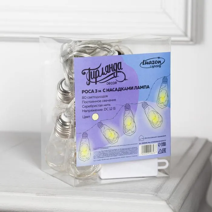 Гирлянда «Нить» 3 м с насадками «Лампа», IP20, прозрачная нить, 80 LED, свечение тёплое белое, 8 режимов, 220 В — Характеристики