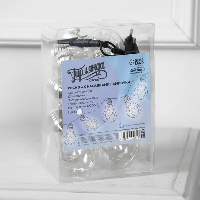 Гирлянда «Нить» 3 м с насадками «Лампочки», IP20, серебристая нить, 100 LED, свечение белое, 3.5 В — Характеристики