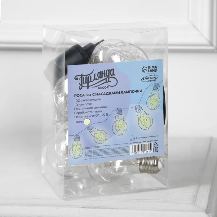 Гирлянда «Нить» 3 м с насадками «Лампочки», IP20, серебристая нить, 100 LED, свечение тёплое белое, 3.5 В — Характеристики