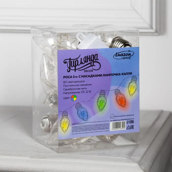 Гирлянда «Нить» 3 м с насадками «Лампочки капля», IP20, прозрачная нить, 80 LED, свечение мульти, 8 режимов, 220 В — Характеристики