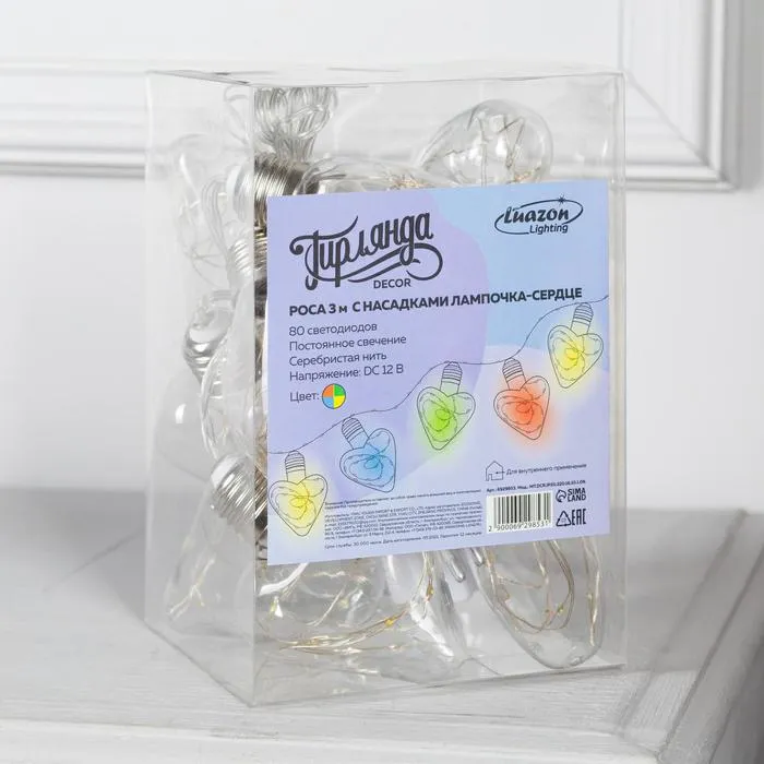 Гирлянда «Нить» 3 м с насадками «Лампочки сердца», IP20, прозрачная нить, 80 LED, свечение мульти, 8 режимов, 220 В — Характеристики